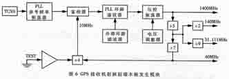 由图5可看出,GP2010的三级变频器采用了中心频率分别为175.42MHz、35.42MHz和4.309MHz的三个中频滤波器。各级混频器需要的本振信号均由片内集成锁相环(PLL)频率合成器提供(如图6所示)。它主要由PLL振荡器回路、鉴相器、PLL环路滤波器、分频器和一个完整的1400MHz压控振荡器(VCO)等元件组成。PLL采用10.000MHz参考频率;VCO的控制增益为150MHz/V、输出频率范围为1386~1414MHz。为了提供高稳定度参考频率源,设计中采用了温度补偿型晶体振荡器(TCXO)自输入阻抗为5kΩ的参考频率提供10.000MHz的AC小信号频率给PLL振荡器。当PLL相位锁定参考信号时,鉴相输出逻辑高电平指示相位已锁定,相位锁定时间约需6ms,环路增益约为150dB。VCO输出的1400MHz信号作为第一本振信号,由其分频产生的140.0MHz、31.111MHz信号分别作为第二本振第第三本振信号。当GP2010接收到1575.42MHz的GPS卫星信号时,通过三级变频可得到4.309MHz的中频信号。